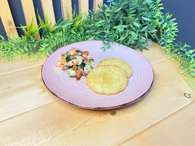 Нежные картофельные драники с золотистой корочкой, обжаренные до идеального баланса текстуры В сопровождении свежего овощного салата: спелые томаты, хрустящие огурцы, листья салата и тонко нарезанный красный лук