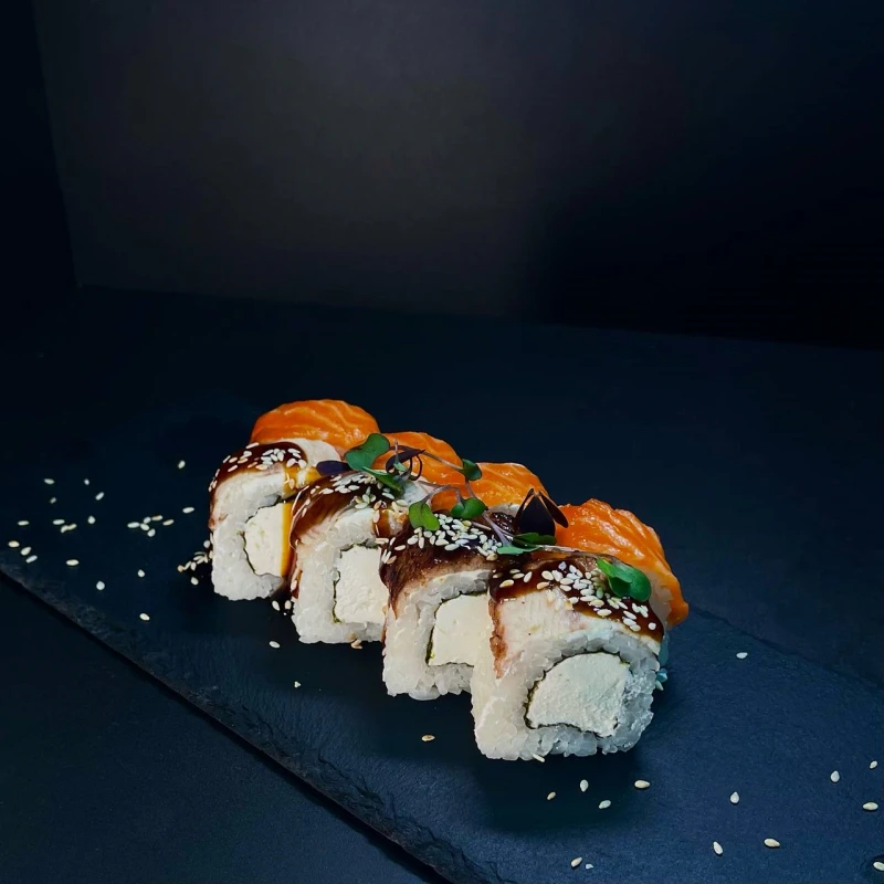 Идеальный дуэт двух любимых вкусов. Половина ролла покрыта свежим лососем, половина ароматным угрем, а внутри - нежный творожный сыр.