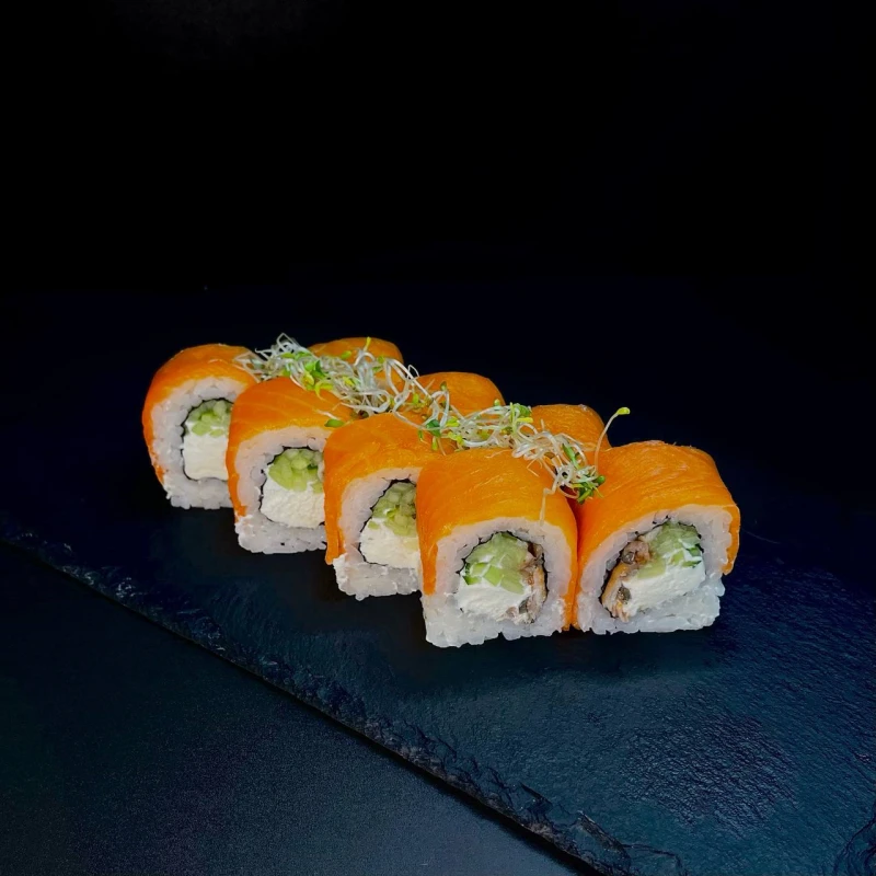 Нежный рис и и бархатный творожный сыр, покрыт свежим лососем, а внутри - хрустящий огурец и сочный ароматный угорь.
