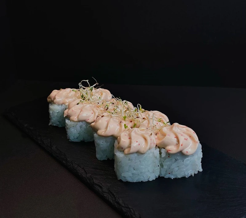 Нежный ролл с выразительным сливочным вкусом. Рис, сливочный сыр, креветка. Сверху соус лава.