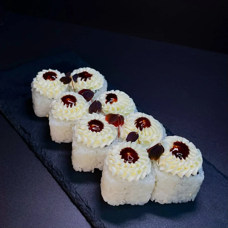 Основа из риса с крабом внутри, а сверху щедро покрыт сливочным сыром и украшен каплями унаги.